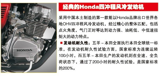 發(fā)動機(jī)耐久性:五羊本田全面執(zhí)行本田全球統(tǒng)一標(biāo)準(zhǔn),在發(fā)動機(jī)耐久性試驗(yàn)方面,國家標(biāo)準(zhǔn)為連續(xù)運(yùn)轉(zhuǎn)100小時,而五羊-本田生產(chǎn)的發(fā)動機(jī)則在全速、全負(fù)荷狀態(tài)下,通過了200小時的耐久性試驗(yàn),是國家標(biāo)準(zhǔn)的200%。