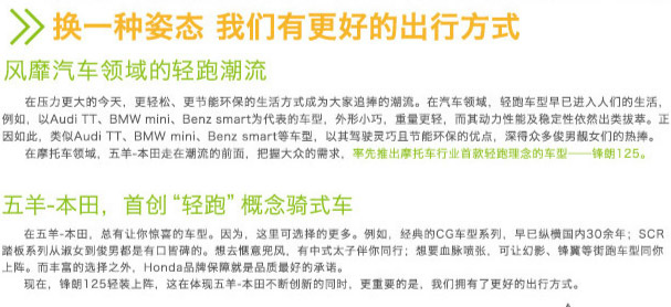 換一種姿態(tài),我們有更好的出行方式,風(fēng)靡汽車領(lǐng)域的輕跑潮流,在壓力更大的今天,更輕松、更節(jié)能環(huán)保的生活方式成為大家追捧的潮流。首先發(fā)布的是國內(nèi)首款“輕跑”概念的街跑車---鋒朗125。在汽車領(lǐng)域,輕跑車型早已進(jìn)入人們的生活。例如,以Audi TT、BMW mini 、Benz Smart為代表的車型,其外型小巧,重量更輕,但其動力性與操控性依然如跑車般出類拔萃。輕跑車型以其駕駛靈巧且節(jié)能環(huán)保的優(yōu)點(diǎn),贏得眾多俊男美女的熱捧。五羊-本田把握消費(fèi)潮流和先機(jī),開發(fā)出摩托車領(lǐng)域首款“輕跑”概念的騎式車——鋒朗125。