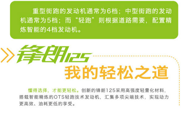 創(chuàng)新的鋒朗125采用高強(qiáng)度輕量化材料,搭載智能精煉的OTS輕跑技術(shù)發(fā)動機(jī),匯集多項(xiàng)頂端技術(shù),實(shí)現(xiàn)動力更高效,油耗更低的享受。